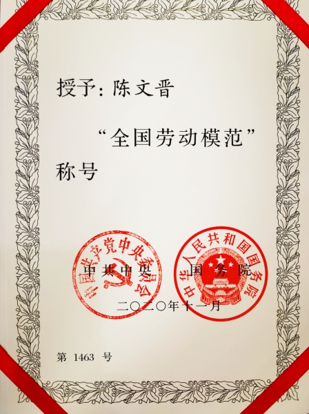 陳文晉同志喜獲“全國勞動模范”榮譽稱號